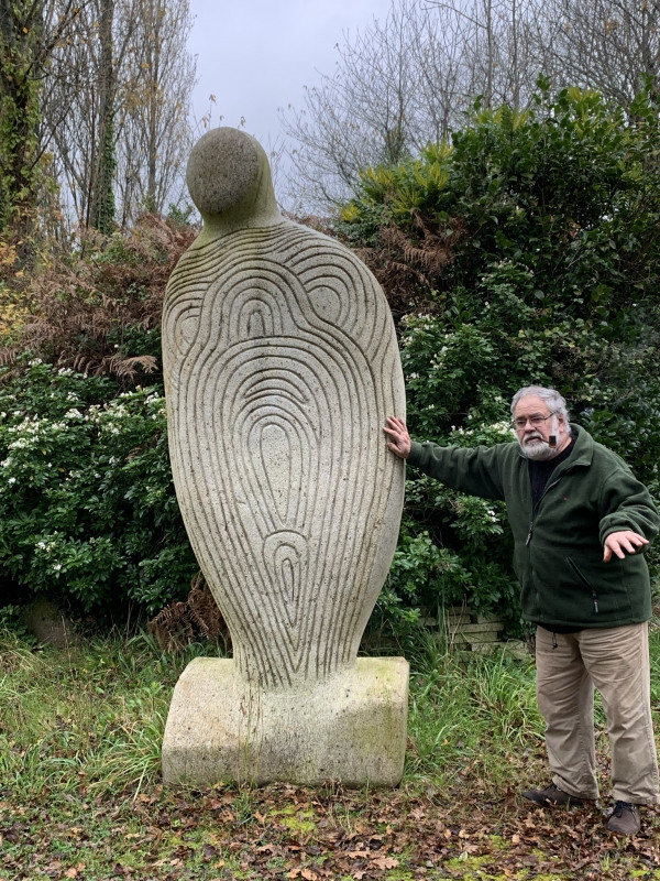 la troisième statue, également sculptée par Bruno Panas, représente Jude Le Paboul . Originaire de Baud, Jude le Paboul a été l’un des grands “passeurs de mémoire”. Il a transcrit de façon manuscrite plus de 300 airs et chansons bretonnes, transmis oralement depuis des générations. Doté d’une excellente mémoire, il contait en breton et en français en faisant participer les spectateurs par le chant, la danse ou la répétition de formules du conte. Pas très grand, un peu rond, il était d’une énergie et d’une mobilité surprenantes. C’était aussi un danseur remarquable. Après la seconde guerre mondiale, il a participé à relancer les cercles celtiques.